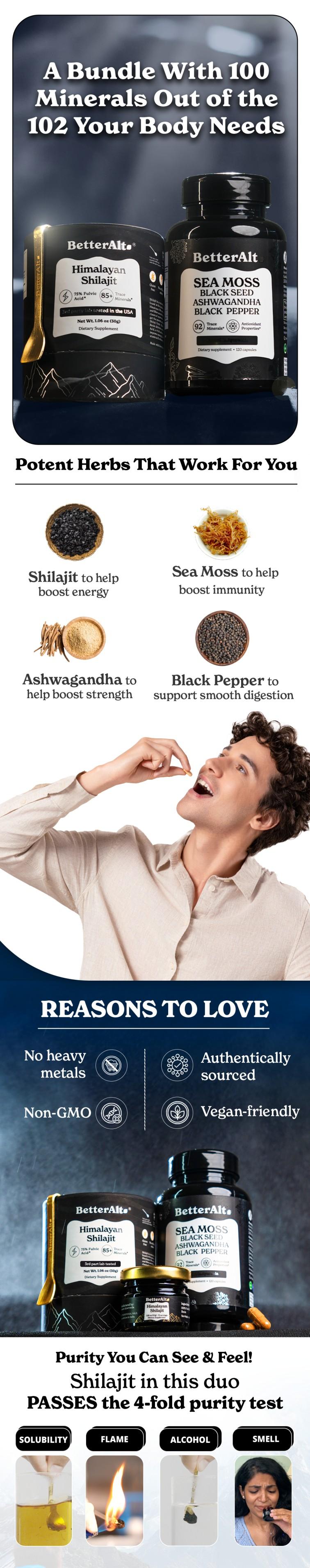 - BetterAlt Shilajit resin and Irish Sea Moss Capsules are lab-tested for purity and free from heavy metals, fillers, and additives.